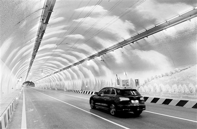 小龙门隧道为跨京冀界特长隧道,北京界和河北界的分界标识分别位于隧道的进出京方向。北青报记者驾车体验发现,施工方在隧道进出京3公里处均喷涂了200米长的山水画。灵山之巅,古树岑参,长城巍峨,蜿蜒曲折,四季之景,尽收眼底。“按照相关规定,特长隧道适宜设置疲劳驾驶唤醒区,因小龙山隧道临近灵山山脉,为和周围景致协调,我们特别邀请了专业美术教师,绘制了山水画。用亮丽的颜色并辅以灯光,避免司机疲劳驾驶。”北京建工市政路桥集团、京蔚高速项目经理葛晨雨介绍。