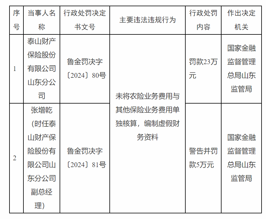 同时,时任泰山财产保险股份有限公司山东分公司副总经理张增乾被警告并罚款5万元。