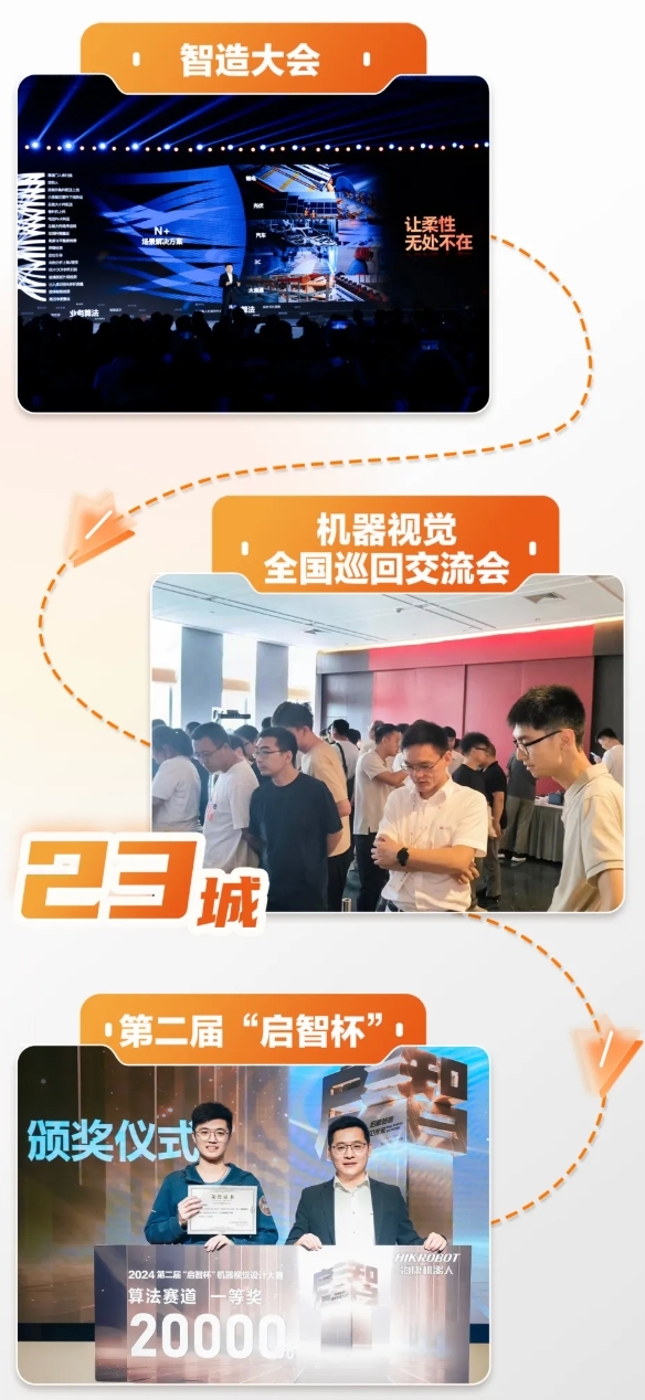 2024年,海康机器人智造大会拉开生态建设帷幕,众多行业领袖、专家学者齐聚一堂,共同探讨前沿科技趋势;机器视觉全国巡回交流会在23个城市接力,行业上下游合作伙伴共话智造;启智杯深化产教融合,为行业培育创新人才。