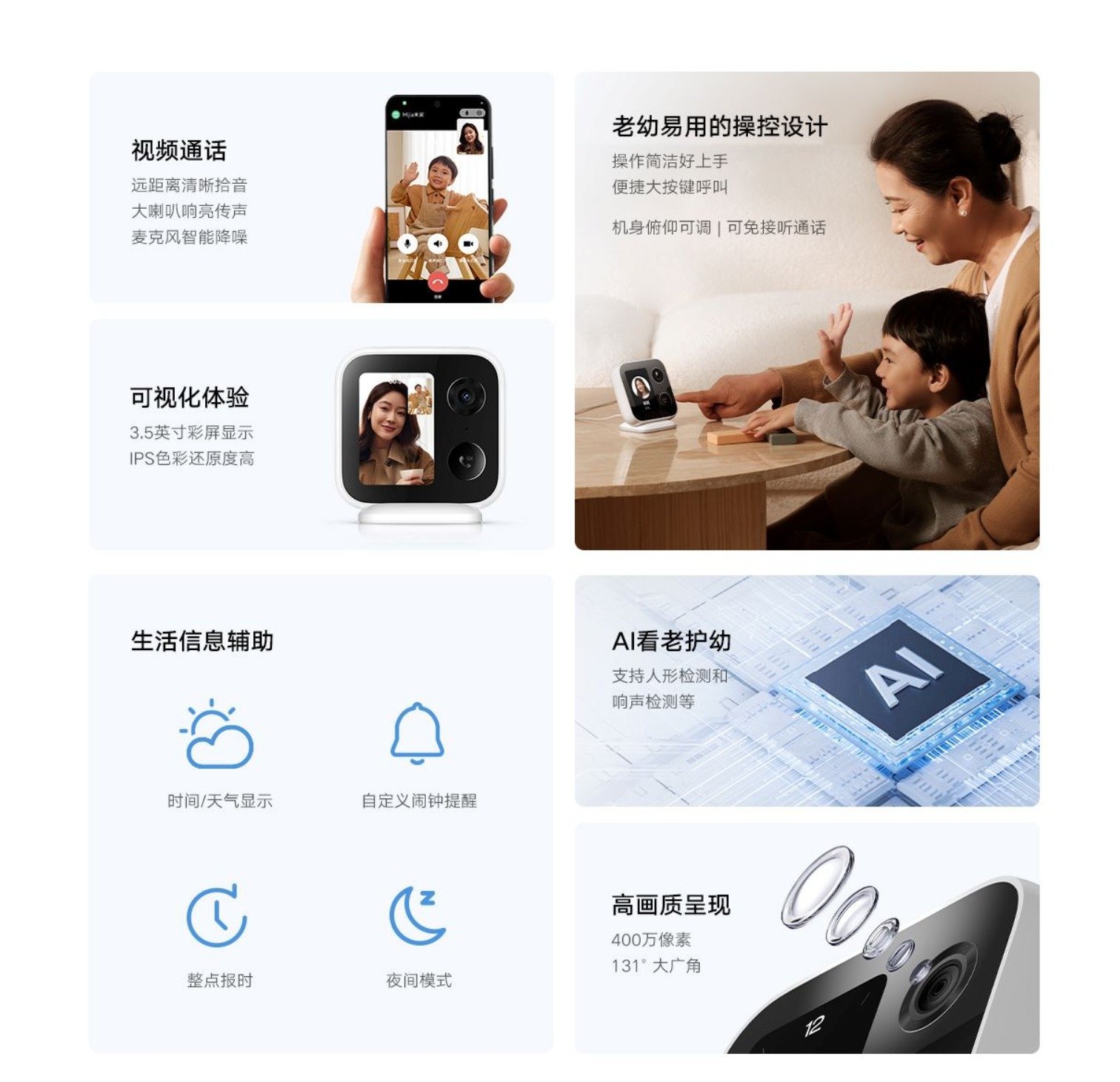 这款产品在外观上相当新奇,与其说像是摄像机,倒不如说是像一台带屏幕的小爱音箱。它在正面采用了一块平面面板,并且配备了一块 3.5 英寸的小屏,并且有麦克风和扬声器。在机身正面的右侧则是两个圆形开孔,上方是摄像头,下方是按键,可以一键呼叫和接听挂断。