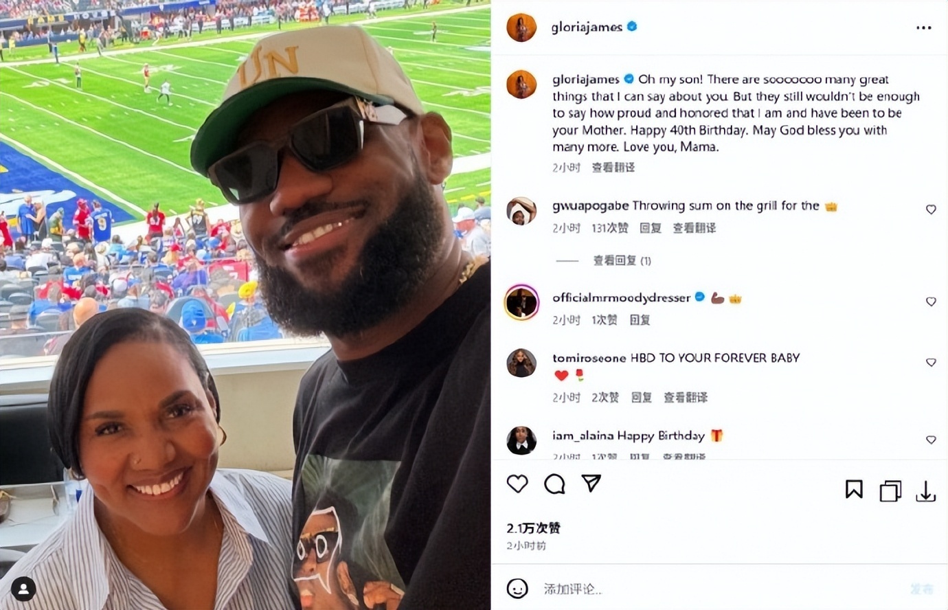 当天,詹姆斯的母亲在社媒发文给儿子庆生: