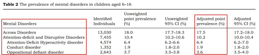 以诊断标准相对严格的JCPP论文为例,虽然里面提到我国6~16岁人群重度抑郁症的患病率仅为2%,但同一人群的整体心理障碍的患病率却达到了17.5%,其中占比最高的是注意力缺陷多动障碍(ADHD),患病率为6.4%,还有对立违抗障碍的患病率也达到了3.6%。