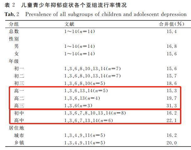 2016年,苏州大学医学部公共卫生学院的学者在《中国儿童保健》上发表的文章通过元分析总结了14篇文献的结果,得出中国儿童青少年抑郁症状流行率的合并值为15.4%[6]。