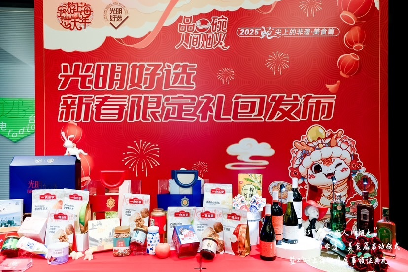 现场3款“光明好选”新春限定礼包,包含了自有品牌 “一食当家”、文旅合作 “一盒上海”、老字号品牌 “玉棠”、“汪裕泰”、 “大白兔”等20余件光明明星产品,在“光明好选”小程序和第一食品南京东路店同步发售,不同的产品组合不仅体现了沪上的年味美食,更彰显着海派传统文化的魅力,传递中国新年的喜庆氛围和美好祝愿。此外,第一食品还准备了大量新年周边和优惠券作为新年礼物回馈给广大消费者。