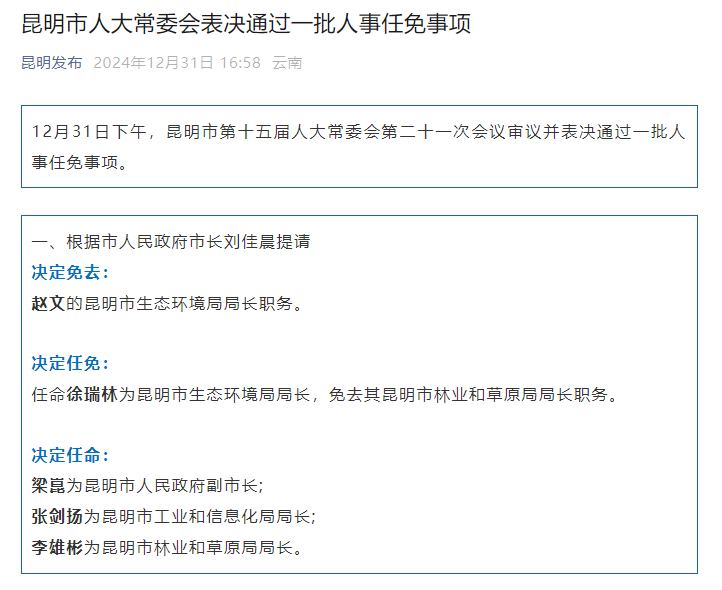 12月31日下午,昆明市第十五届人大常委会第二十一次会议审议并表决通过一批人事任免事项。