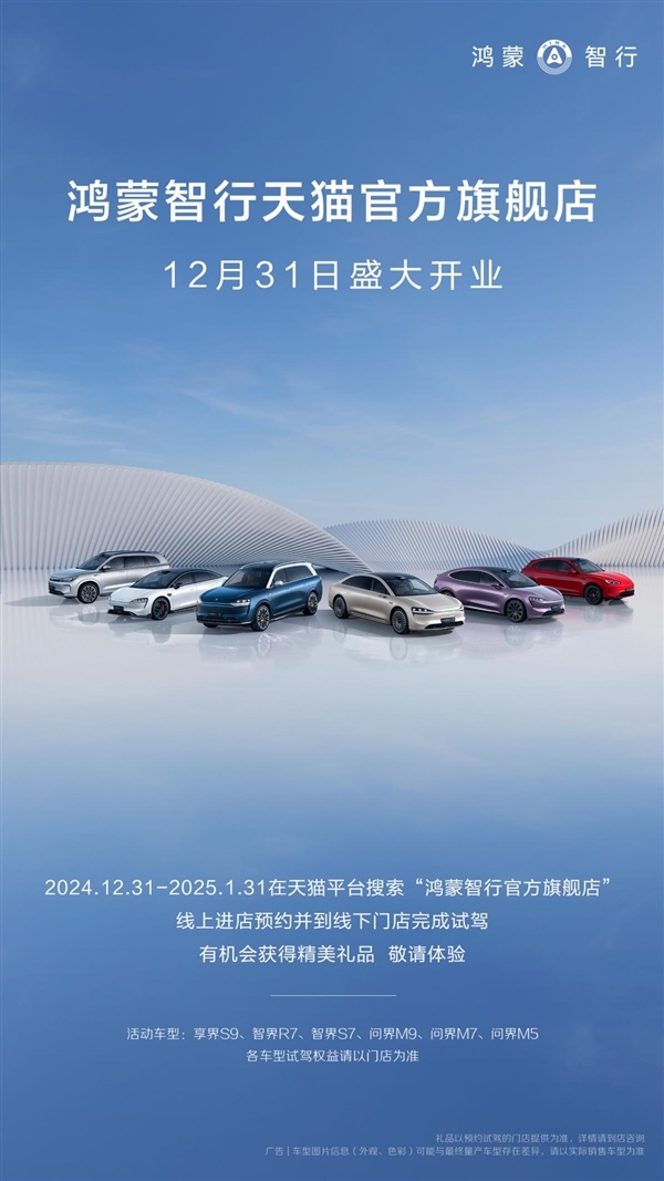 同时官方还推出了限时礼赠活动,2024年12月31日-2025年1月31日在天猫/京东平台搜索“鸿蒙智行官方旗舰店”,线上进店预约并到线下门店完成试驾,有机会获得精美礼品。