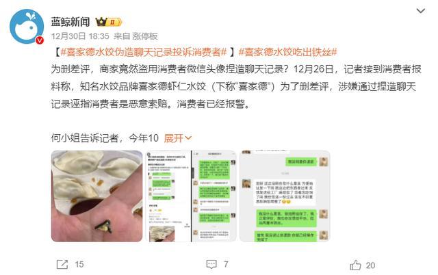 在水饺中吃出铁丝后,商家为删差评,竟假冒消费者伪造聊天记录?近日,知名连锁水饺品牌喜家德因为此事在网上引发了热议。