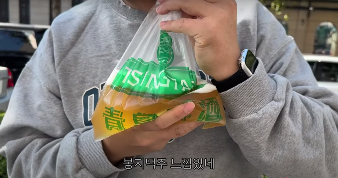 来青岛,一定要品尝袋装的青岛啤酒。图源/YouTube @노포바니