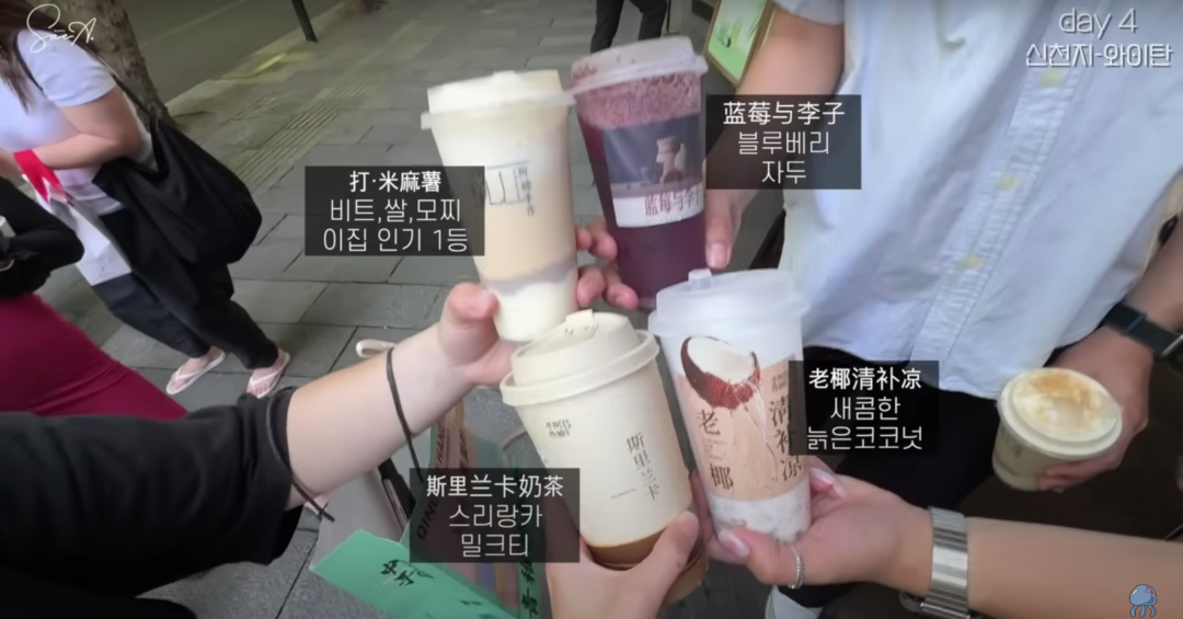 Saea和朋友们一起排队买奶茶。图源/YouTube @해피새아 happysaea