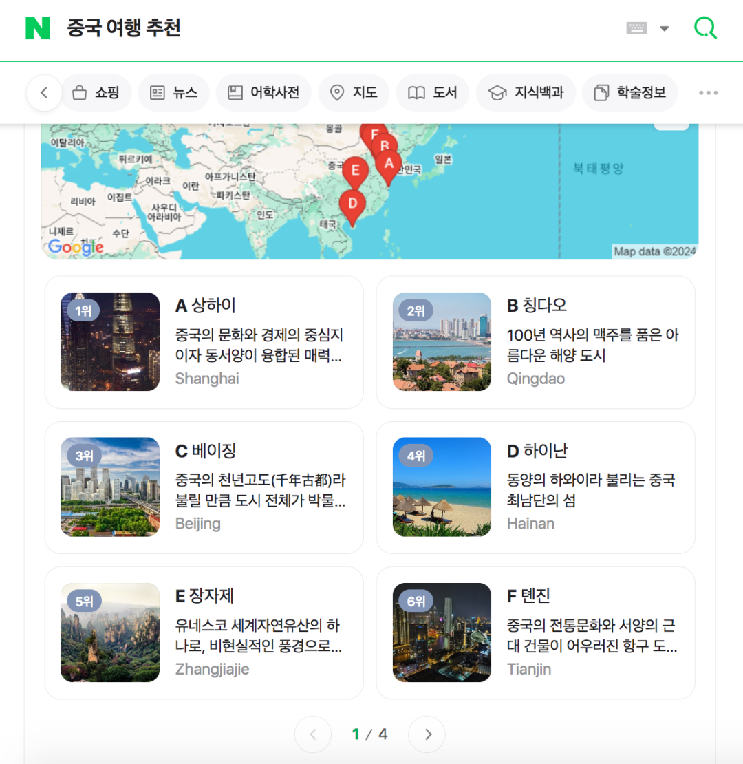 韩国第一大搜索引擎Naver显示的中国热门旅游目的地。图/网站截图