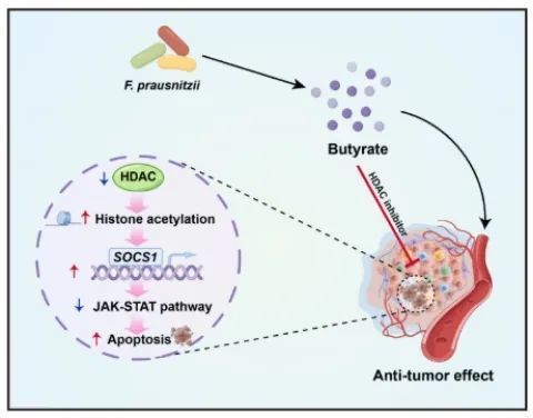 为了明确肠道F. prausnitzii对NKTCL发展的作用,通过构建NKTCL荷瘤小鼠模型,研究者们发现肠道F. prausnitzii增补能够显著抑制NKTCL的发展。代谢组学分析以及一系列体内外研究结果表明F. prausnitzii代谢物丁酸是介导这一肿瘤抑制作用的关键分子。机制上,研究人员发现丁酸能够显著增强NKTCL肿瘤细胞SOCS1基因启动子区域组蛋白的乙酰化水平并促进该基因的表达,进而抑制NKTCL中高度激活的致癌JAK-STAT通路,抑制肿瘤的发展。