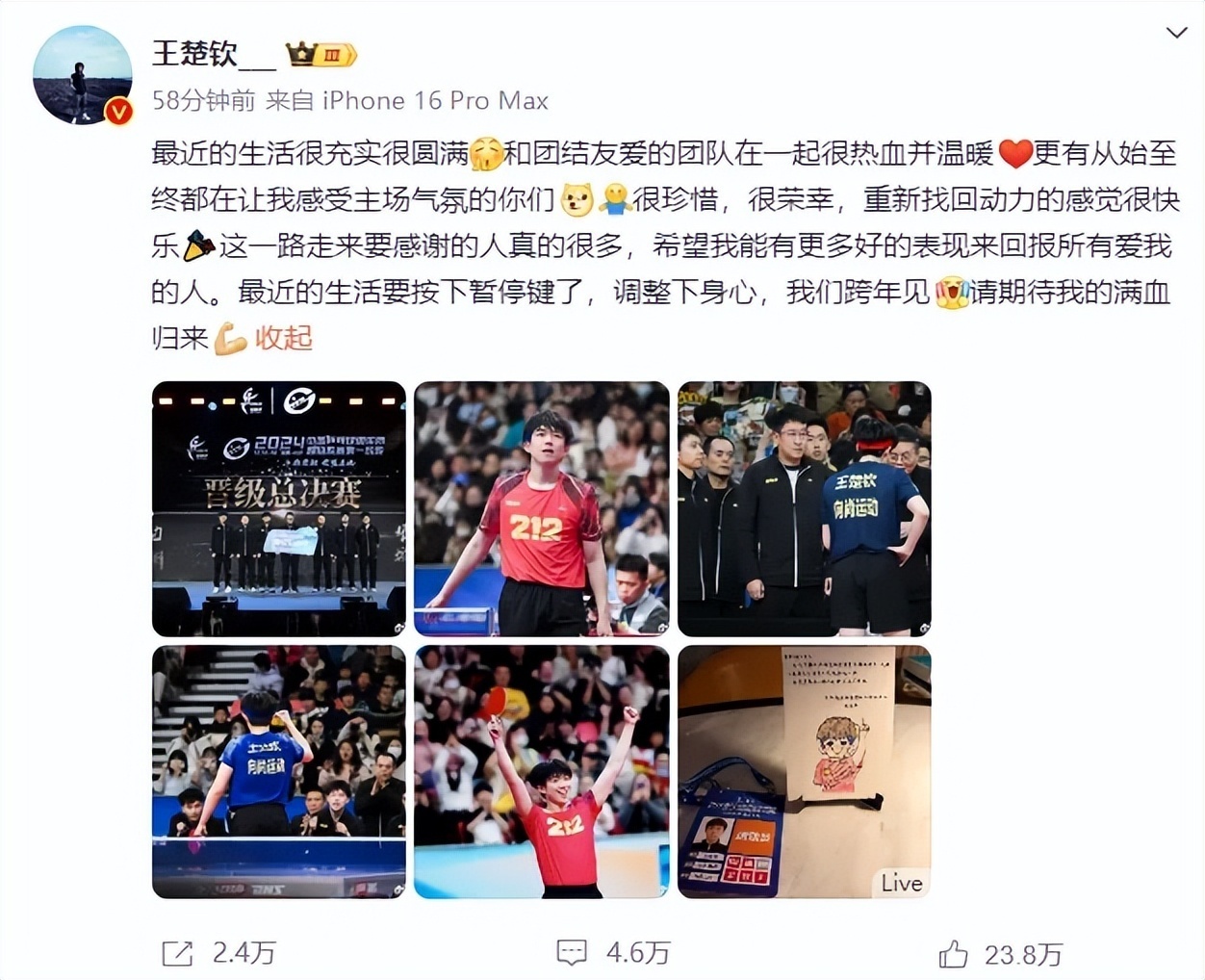 王楚钦表示自己近期将调整身心,喊话大家跨年见,“最近的生活要按下暂停键了,请期待我的满血归来!”