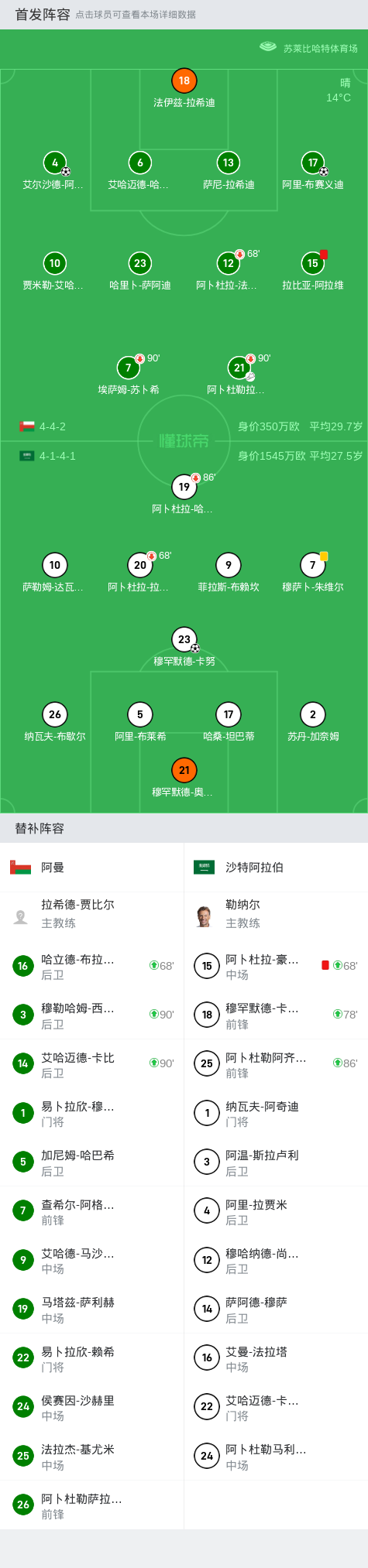 第74分钟,阿拉维任意球直接破门打破场上僵局,阿曼1-0沙特阿拉伯