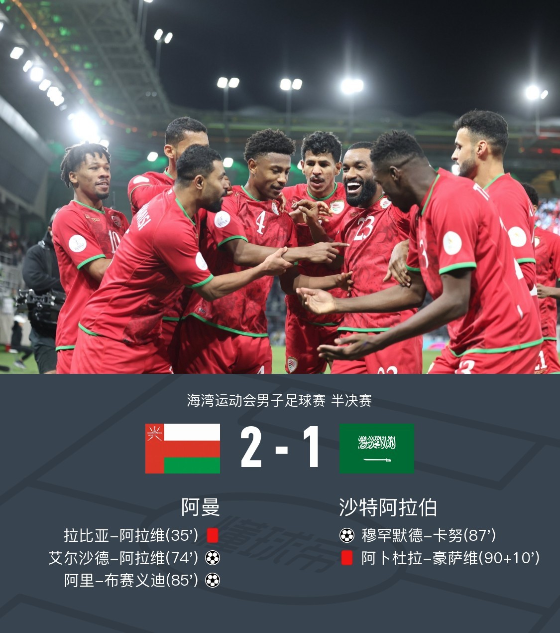 在海湾运动会男子足球赛的半决赛中,阿曼与沙特阿拉伯展开了一场激烈的对决。比赛中,阿曼队的艾尔沙德-阿拉维率先为球队打破僵局,随后阿里-布赛义迪再下一城,扩大了领先优势。沙特阿拉伯队的穆罕默德-卡努则为球队扳回一球,展现了顽强的斗志。比赛过程中,双方各有一名球员被罚下场,场上局势一度紧张。最终,阿曼以2-1的比分战胜沙特阿拉伯,成功晋级。