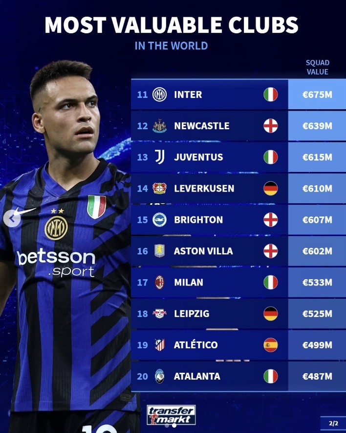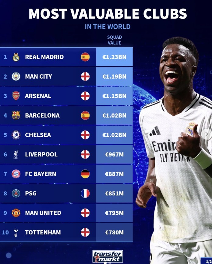北京时间1月1日,德国转会市场列出了俱乐部身价榜TOP20。其中,皇马12.3亿欧居首,曼城、阿森纳位列前三。
