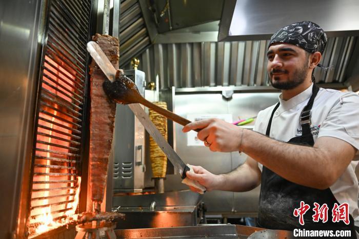 浙江义乌素称“世界超市”,是全球小商品集散地,多年来以开放和国际化吸引着世界各地的客商纷至沓来。据了解,每年来义乌的外商多达60万人次左右,常住外国人已超1.6万。如今承载乡愁和记忆的异域美食也在义乌“遍地开花”,外国风味餐厅在义乌稠州北路、宾王商贸区等地“连片成势”。“世界超市”里诞生“国际美食城”。图为12月28日,义乌搏斯餐厅厨师制作土耳其烤肉,该餐厅在义乌已有17年,其主打的土耳其菜一度吸引众多外国人,如今越来越多的中国食客也纷纷“打卡”。中新社记者 王刚 摄