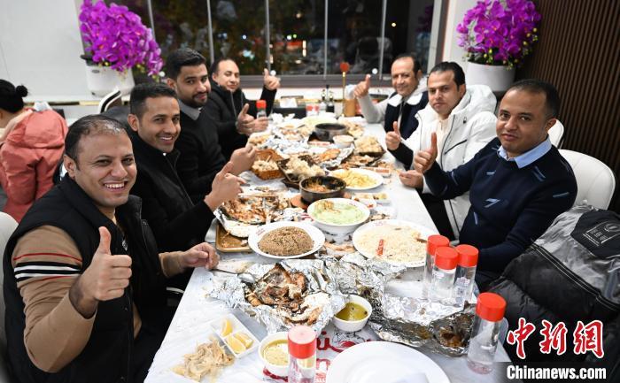 浙江义乌素称“世界超市”,是全球小商品集散地,多年来以开放和国际化吸引着世界各地的客商纷至沓来。据了解,每年来义乌的外商多达60万人次左右,常住外国人已超1.6万。如今承载乡愁和记忆的异域美食也在义乌“遍地开花”,外国风味餐厅在义乌稠州北路、宾王商贸区等地“连片成势”。“世界超市”里诞生“国际美食城”。图为12月28日,外籍人士在义乌辛巴达餐厅为也门美食点赞。中新社记者 王刚 摄