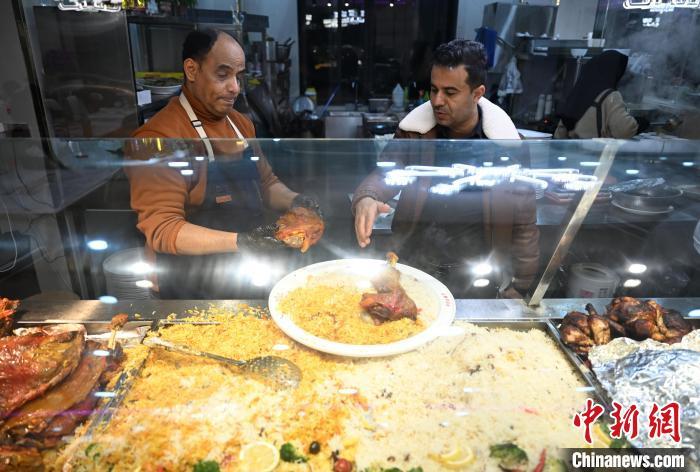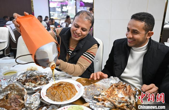 浙江义乌素称“世界超市”,是全球小商品集散地,多年来以开放和国际化吸引着世界各地的客商纷至沓来。据了解,每年来义乌的外商多达60万人次左右,常住外国人已超1.6万。如今承载乡愁和记忆的异域美食也在义乌“遍地开花”,外国风味餐厅在义乌稠州北路、宾王商贸区等地“连片成势”。“世界超市”里诞生“国际美食城”。图为12月28日,外籍人士在义乌辛巴达餐厅享用也门美食。中新社记者 王刚 摄