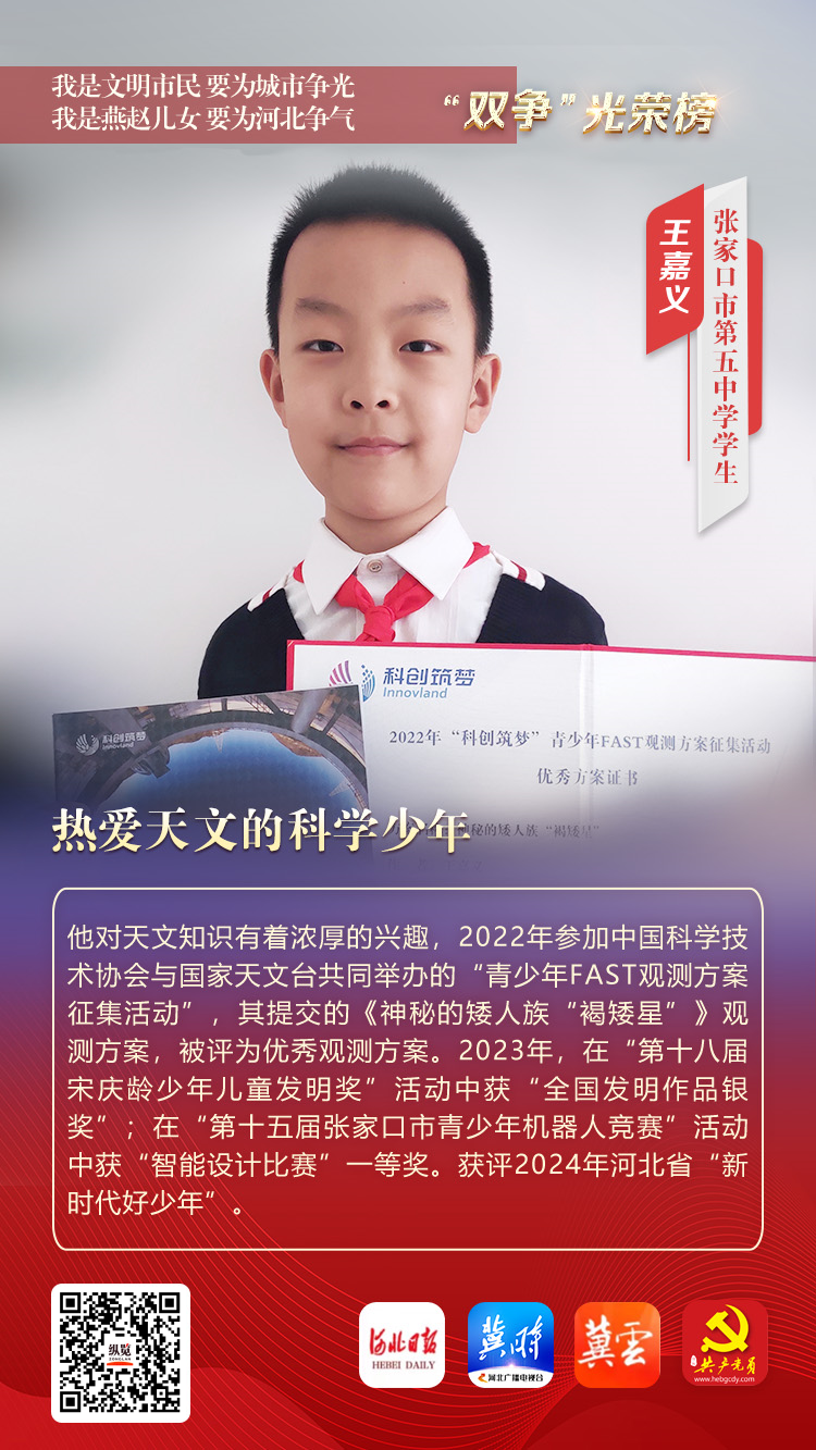 他对天文知识有着浓厚的兴趣,2022年参加中国科学技术协会与国家天文台共同举办的“青少年FAST观测方案征集活动”,其提交的《神秘的矮人族“褐矮星”》观测方案,被评为优秀观测方案。2023年,在“第十八届宋庆龄少年儿童发明奖”活动中获“全国发明作品银奖”;在“第十五届张家口市青少年机器人竞赛”活动中获“智能设计比赛”一等奖。获评2024年河北省“新时代好少年”。