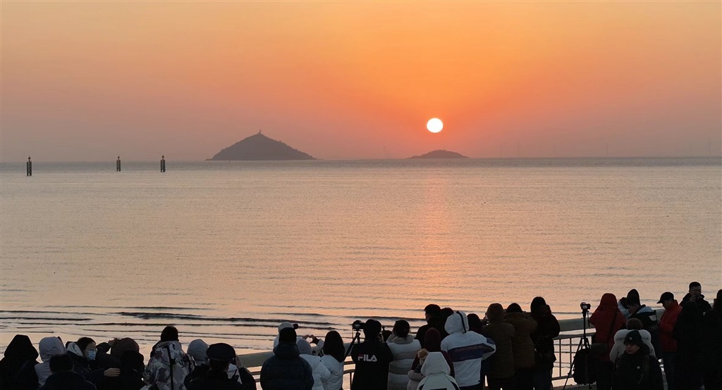 2025年1月1日清晨,不少市民游客来到沪郊金山滨海岸线,共同迎接新年的第一缕阳光。