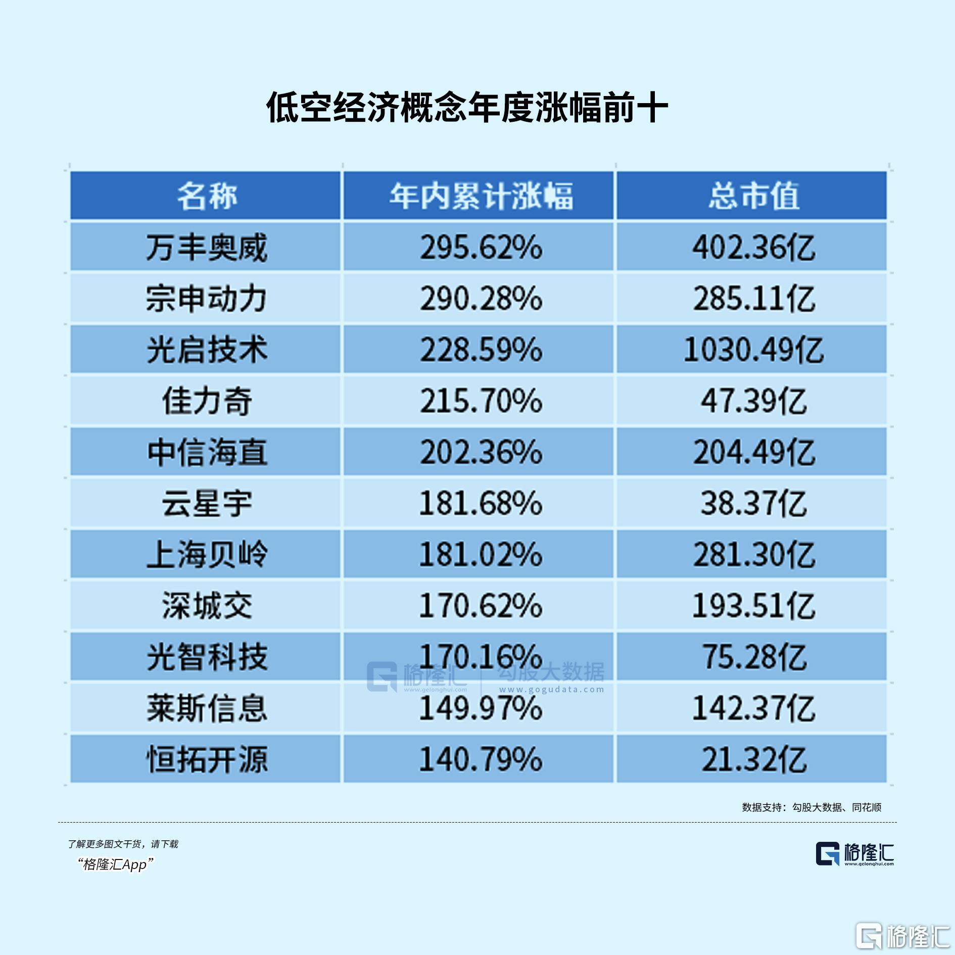 从全年表现来看,万丰奥威、宗申动力年度涨幅接近300%,光启技术、佳力奇、中信海直年度涨幅均超过200%。