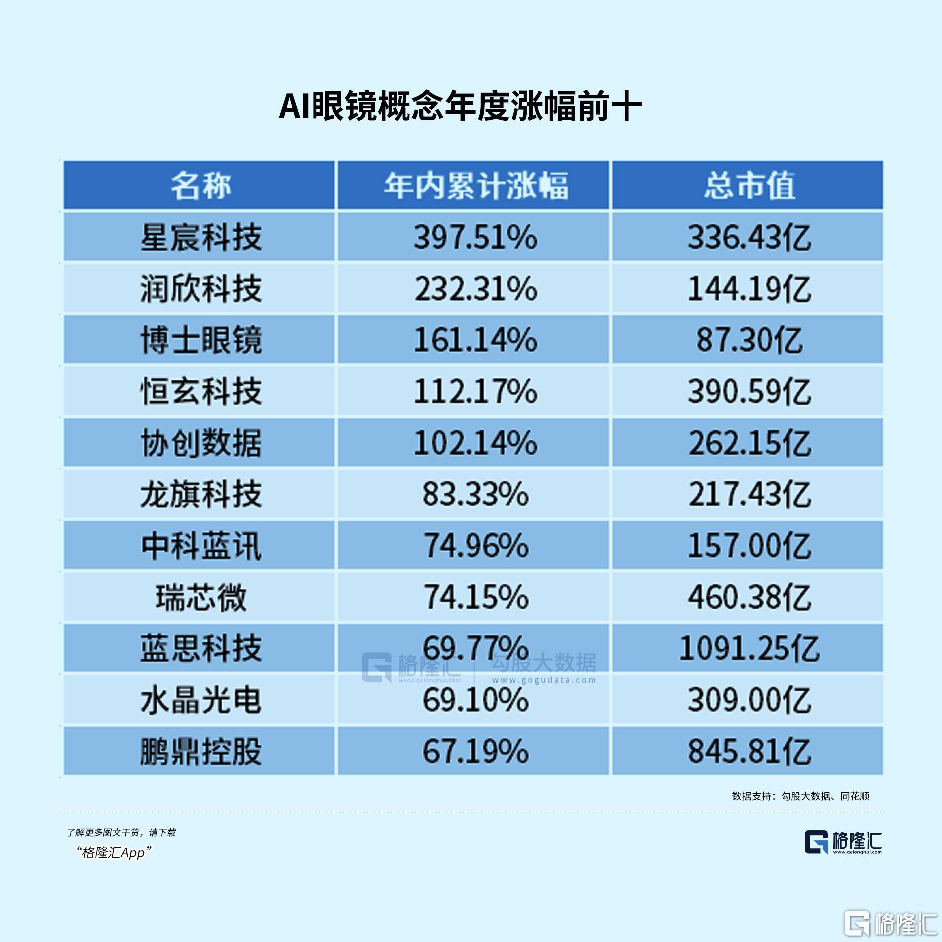 从全年表现来看,星宸科技年度涨幅接近400%,润欣科技年涨幅超230%,博士眼镜、恒玄科技、协创数据年涨幅均超过100%。