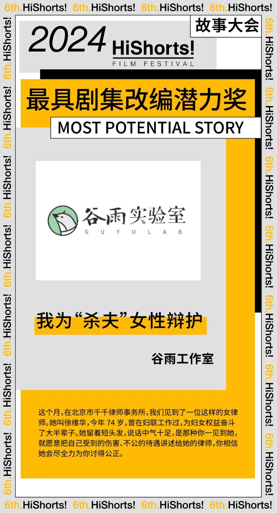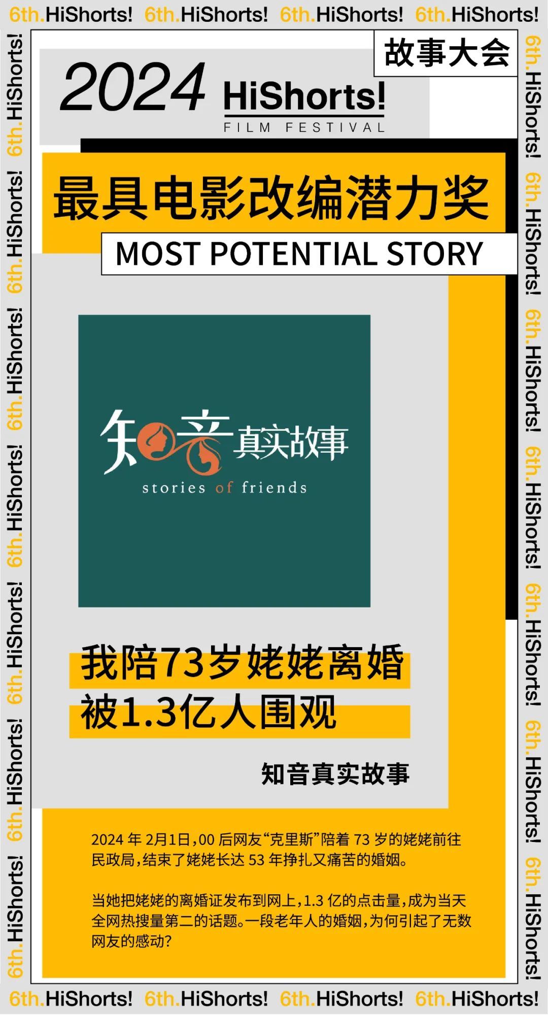 故事大会,作为HiShorts! 的核心板块,是我们在纪录领域的一种延伸。我们坚信,现实生活中的故事往往具有超越虚构剧本的吸引力和感染力。在此舞台上,观众有幸见证了众多基于真人真事改编的杰出作品。本届故事大会最终有 3 个故事项目分别获得最具电影改编潜力奖,最具剧集改编潜力奖和评审团特别关注奖。