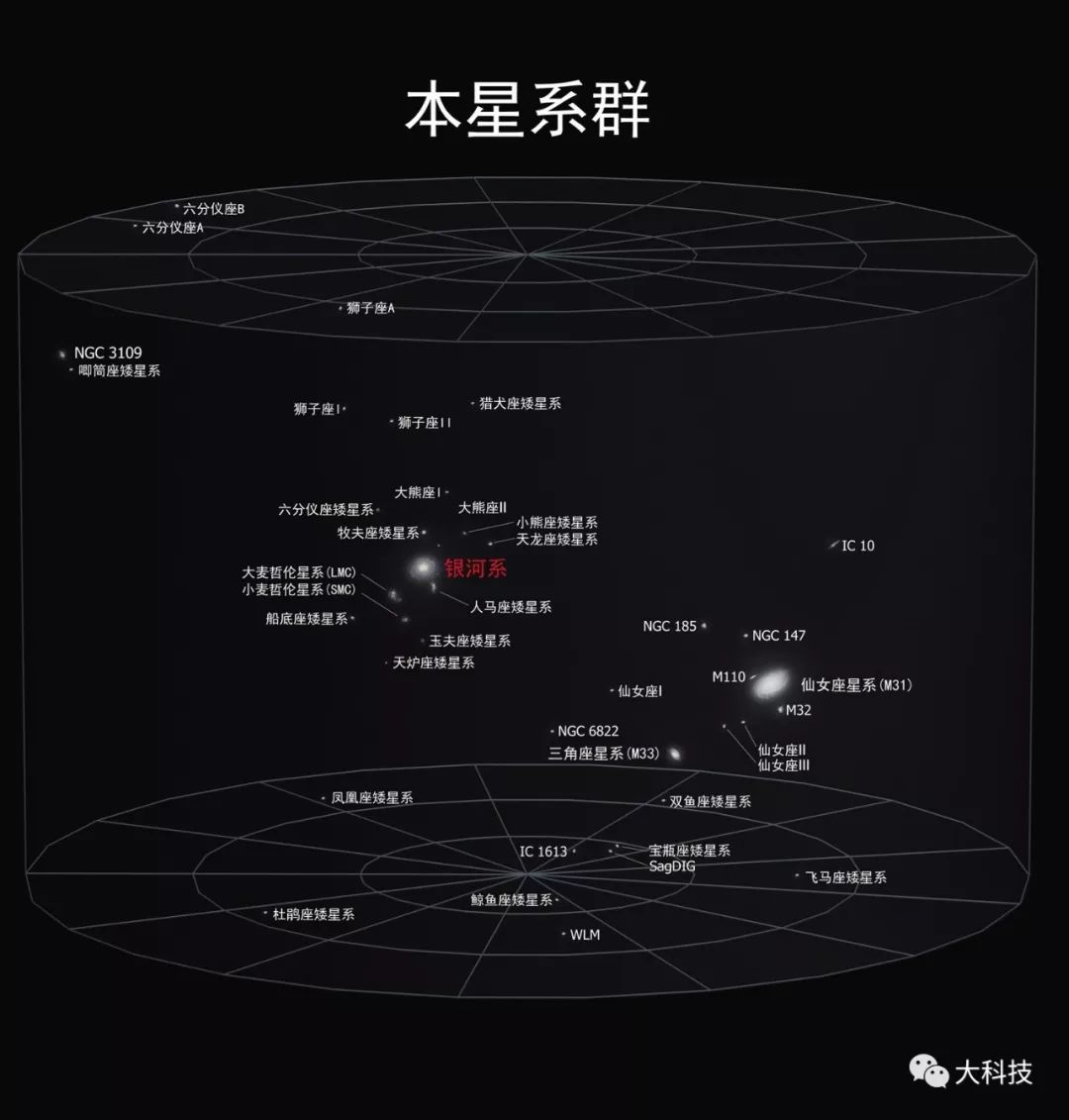 我们的银河系,以及附近的仙女座星系、三角座星系、大小麦哲伦星云,再加上周围几十个更小的星系,它们一起构成了一个星系小家庭,即本星系群。本星系群的直径只有约1000万光年,成员内彼此间由于引力作用会发生撕扯或碰撞。例如,银河系曾撕裂很多矮星系,留下的残余分布在银河系的外围。此外,银河系和仙女座会在十几亿年之后碰撞到一起。