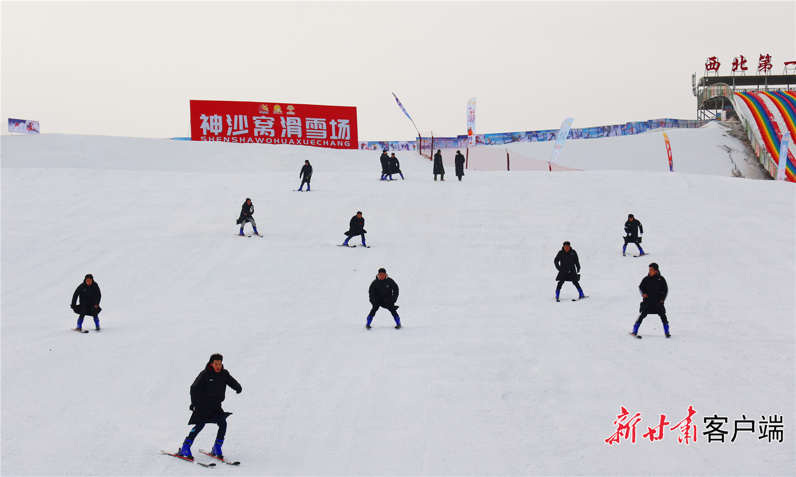 户外体育运动爱好者在张掖国家沙漠体育公园体验滑雪乐趣