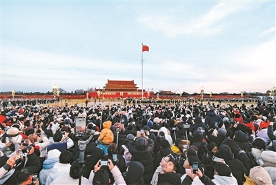 昨日清晨,市民游客在天安门广场观看升国旗仪式,共同迎接2025年的第一天。7时36分,北京天安门广场上,军乐团奏乐,5.1万名群众在现场高唱国歌,鲜艳的五星红旗与朝阳一同升起。