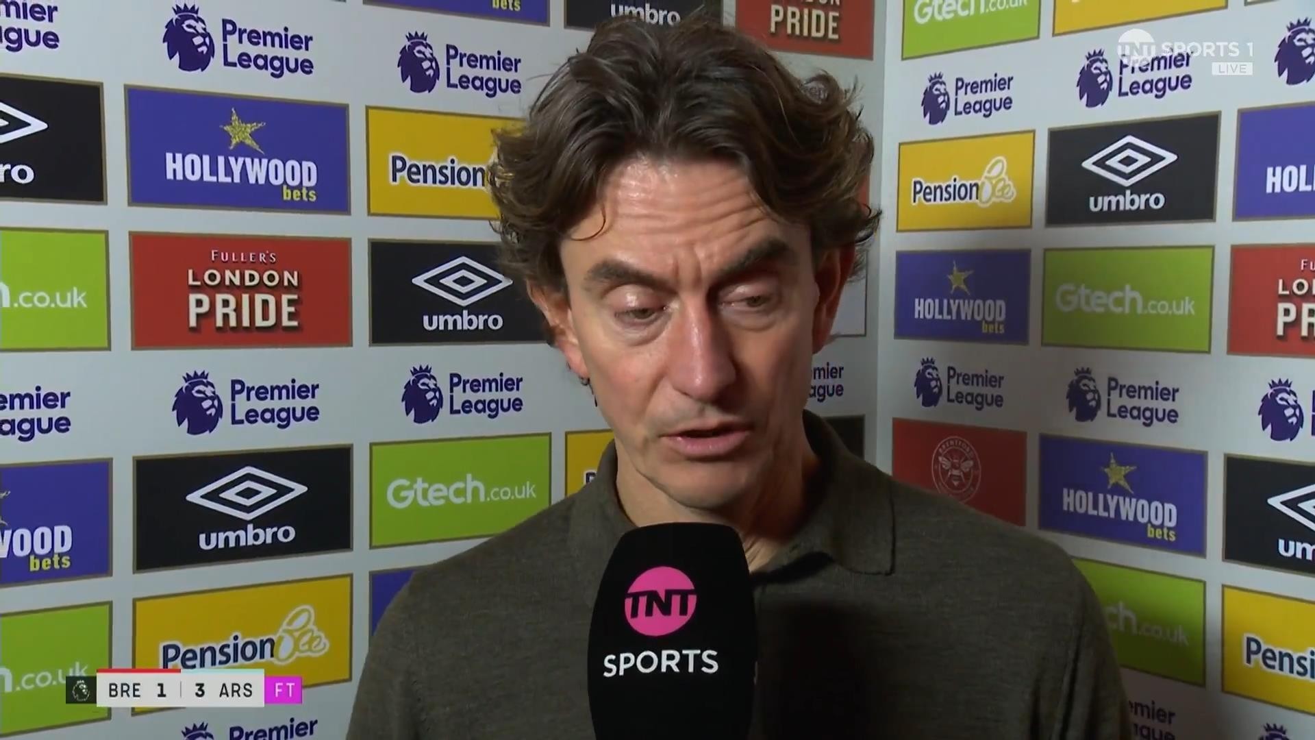 率队在英超第19轮主场1-3不敌阿森纳之后,布伦特福德主教练托马斯-弗兰克接受了来自TNT体育的采访。