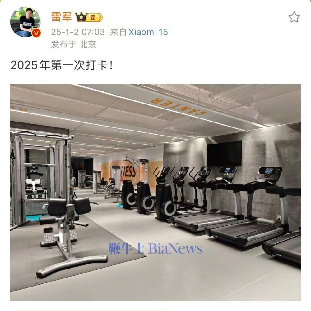 鞭牛士 1月2日消息,小米创始人雷军今日发文称开启2025年第一次健身打卡引发网友围观。据了解,雷军在2024年12月31日的跨年直播中许下三个新年愿望,其中之一就是2025年要好好健身,打算在健身房打卡100次。