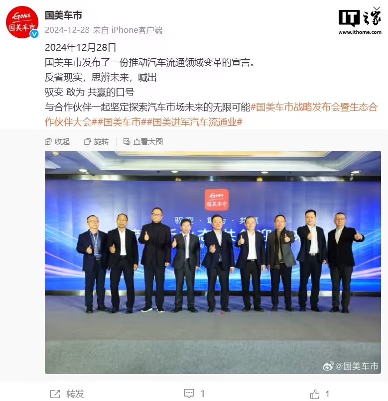 IT之家 1 月 1 日消息,国美车市战略发布会暨生态合作伙伴大会于 2024 年 12 月 28 日在北京举行,国美宣布进军汽车行业,推出汽车流通品牌“国美车市”。