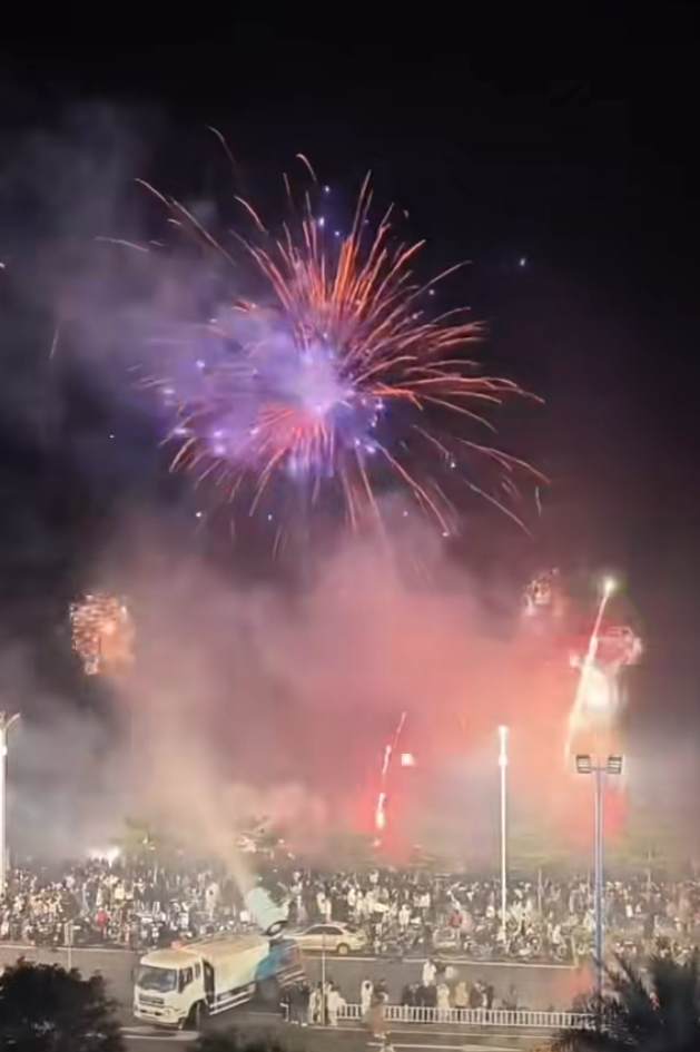 现场视频显示,市民和游客在金滩自发组织“跨年烟花秀”,沙滩上站满了人。烟花绽放时,四周灰尘弥漫,附近有一辆雾炮车正在洒水。拍摄者配文称:“边放烟花,边洒水,北海好宠。”