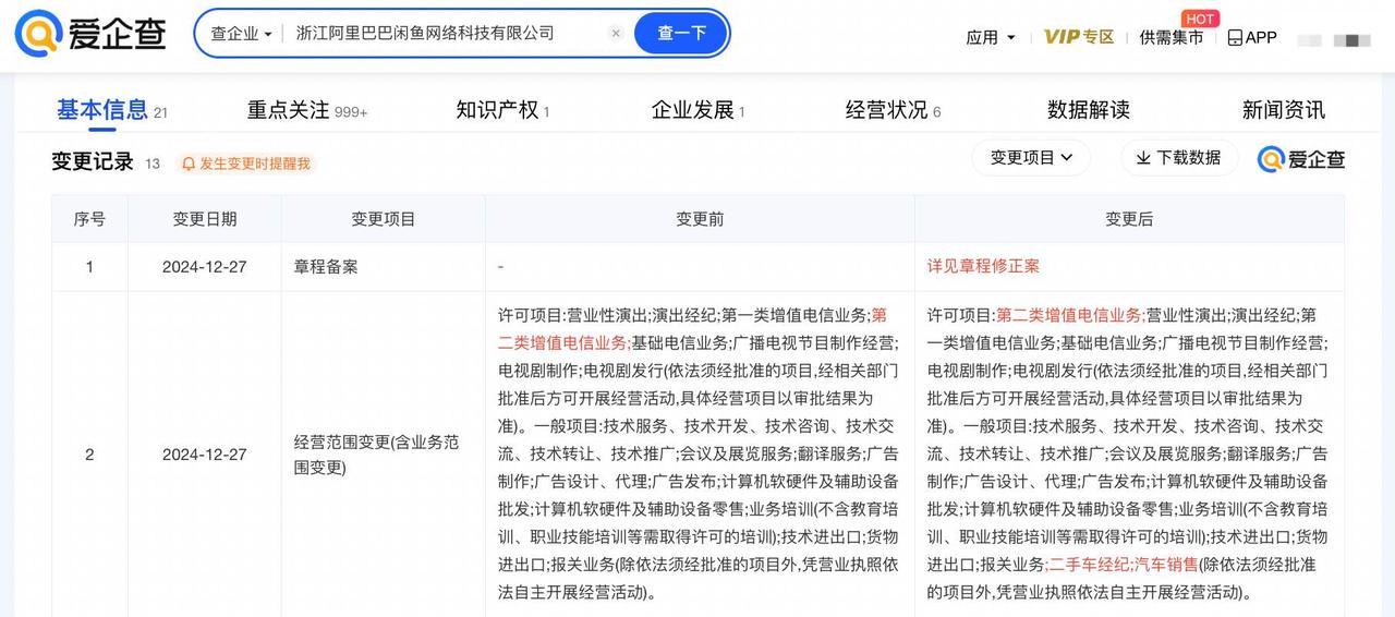 #闲鱼#爱企查App显示,近日,浙江阿里巴巴闲鱼网络科技有限公司发生工商变更,经营范围新增二手车经纪、汽车销售。