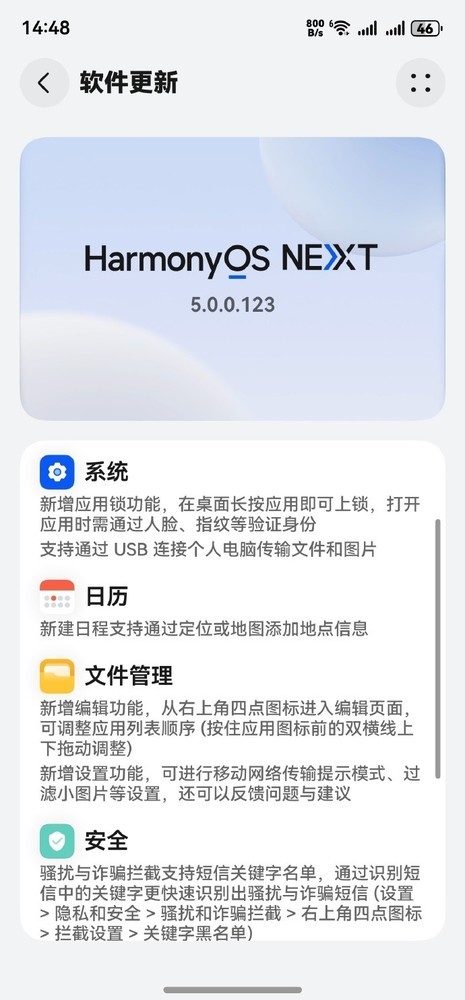 【CNMO科技消息】1月2日,据博主@Adak封狼居胥 消息,华为Mate70系列和nova 12 Ultra的HarmonyOS NEXT 5.0.0.123版本已在规模推送中。这次更新带来了不少实用的新功能,比如应用锁、文件管理中的文件分区以及更便捷的USB传输。
