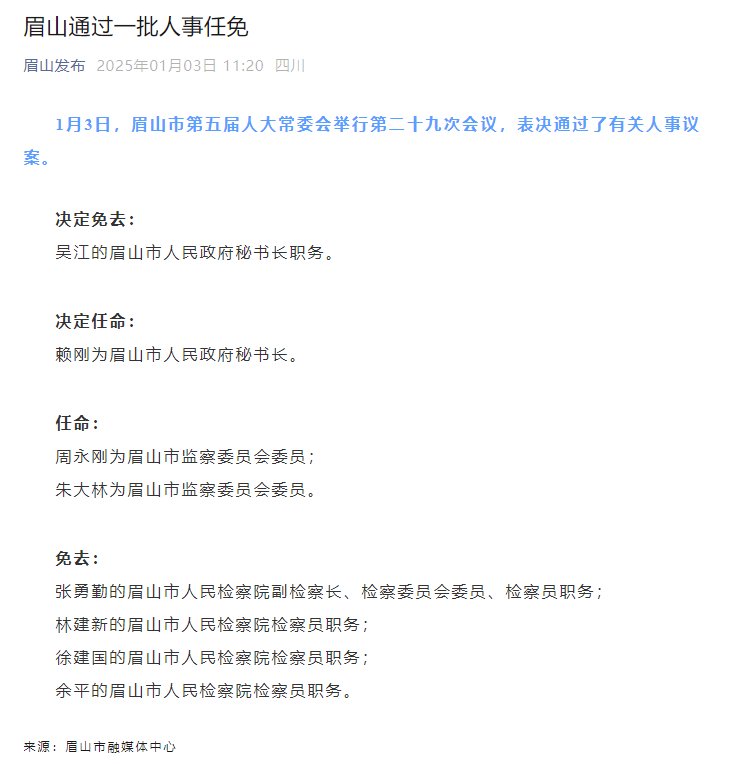 据眉山发布:1月3日,眉山市第五届人大常委会举行第二十九次会议,表决通过了有关人事议案。
