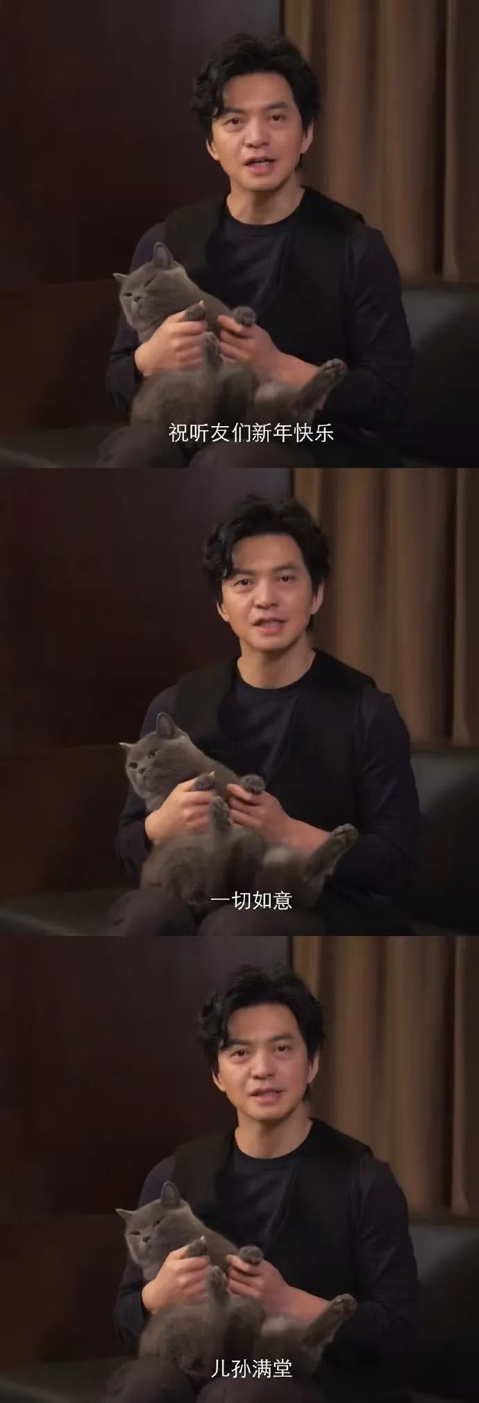 元旦当天,歌手李健抱着小猫李小虎一起送出了新年的祝福,他说: