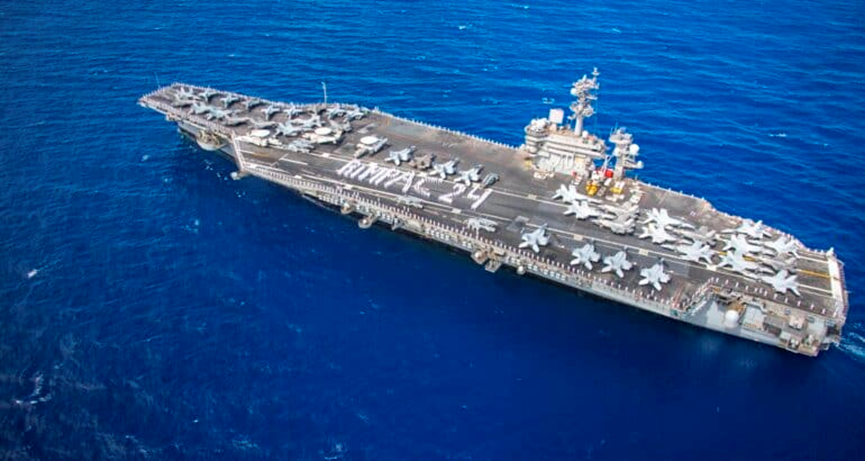2024年6 月 25 日,尼米兹级航空母舰卡尔文森号 (CVN 70) 的水兵在飞行甲板上组成“RIMPAC 24”,该舰抵达珍珠港-希卡姆联合基地,参加 2024 年环太平洋军演 (RIMPAC)