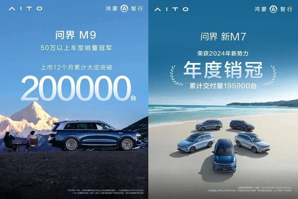其中,问界M9发布12个月累计大定突破20万辆,连续9个月蝉联中国市场50万以上月度销冠,而问界M7也在2024年累计交付了19.59万台,可谓是十分成功了。