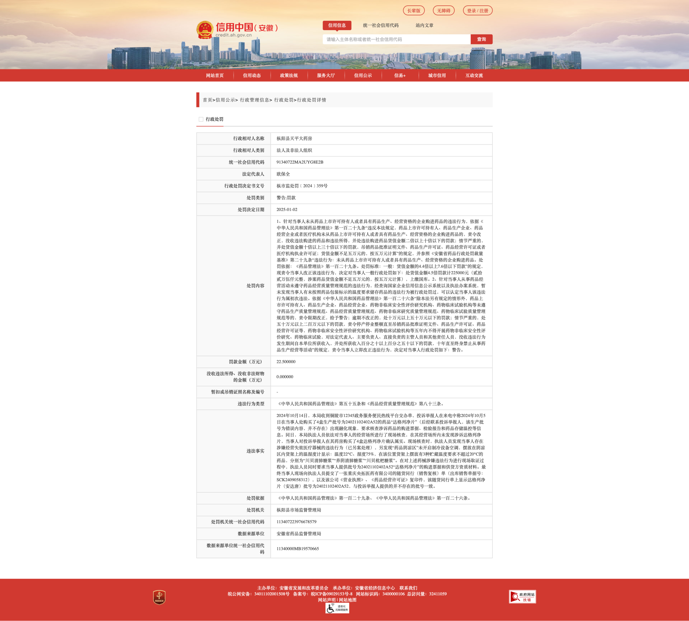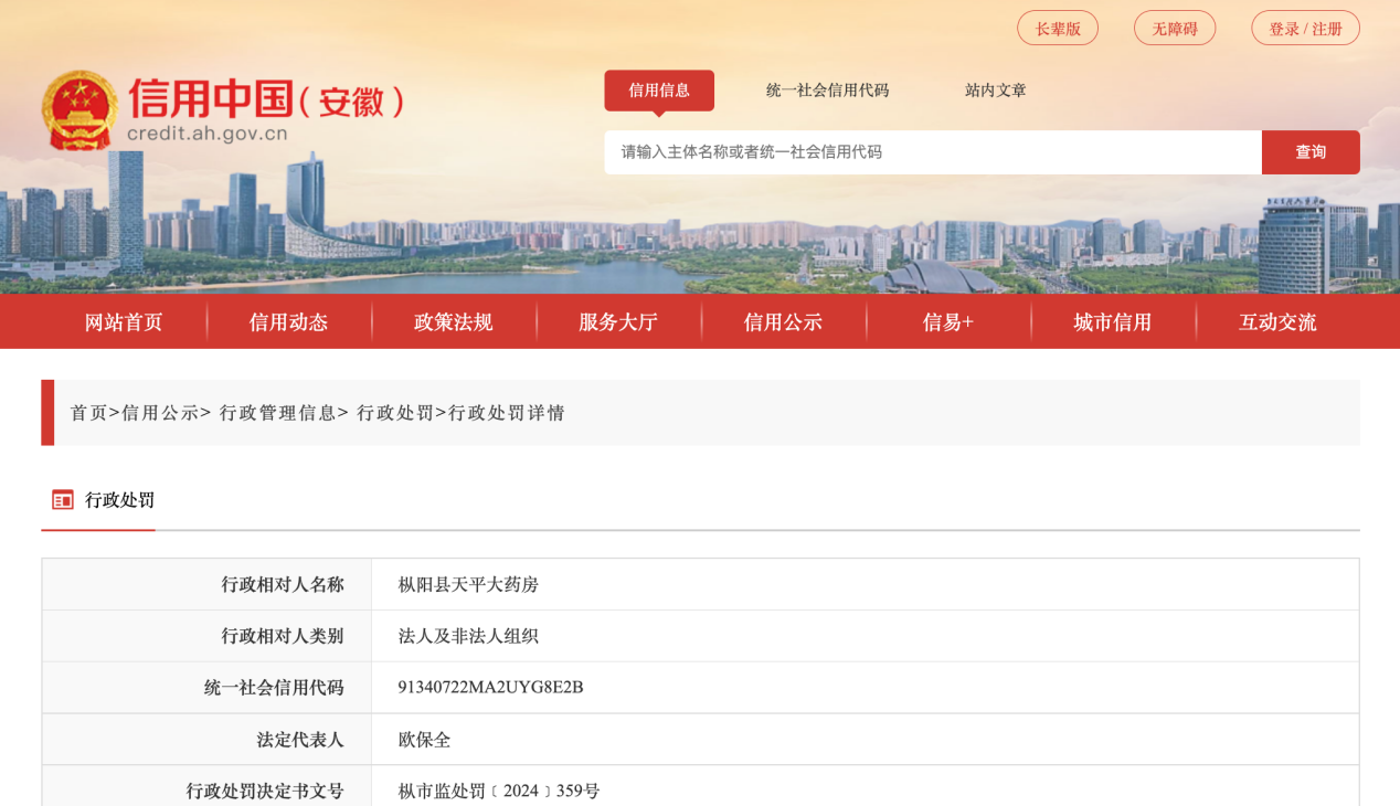 近日,信用安徽披露行政处罚信息,因未从规定渠道购进药品、未遵守药品经营质量管理规范,枞阳县天平大药房被罚款22.5万元并处以警告,行政处罚决定书文号为枞市监处罚﹝2024﹞359号。