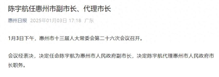 会议经表决,决定任命陈宇航为惠州市人民政府副市长,决定陈宇航代理惠州市人民政府市长职务。