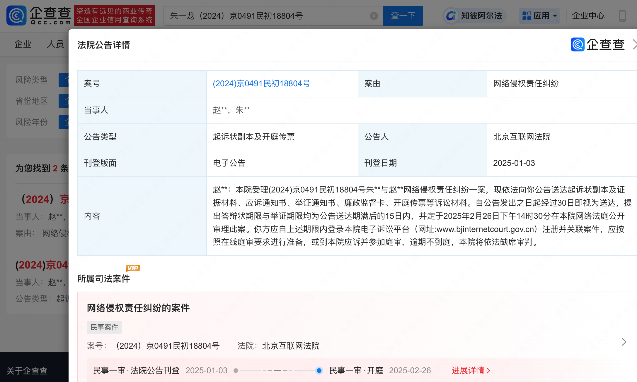 企查查APP显示,1月3日,法院送达朱一龙与赵某某网络侵权责任纠纷起诉状副本及开庭传票等,案件将于2月26日在北京互联网法院开庭审理。