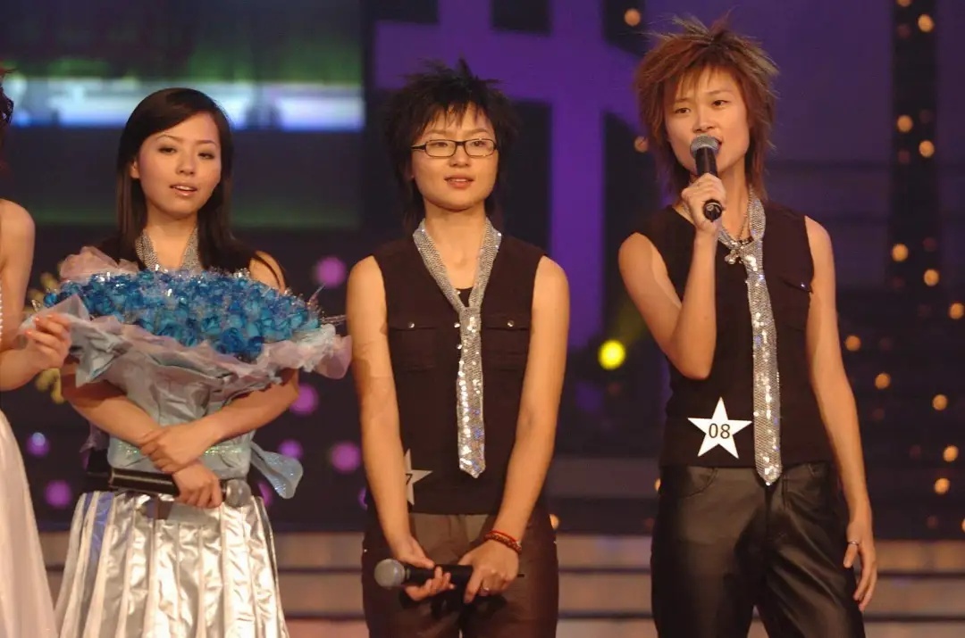 2005“超级女声”全国冠军总决选现场。(左-右)张靓颖、周笔畅、李宇春。图源:VCG
