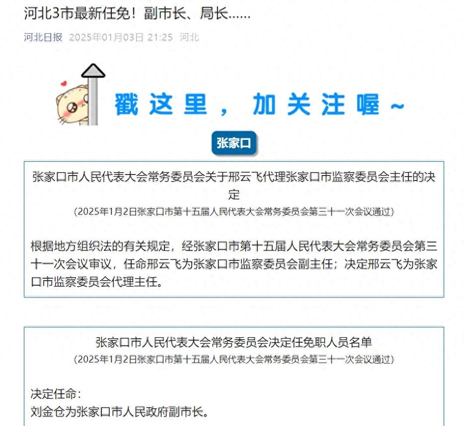 根据地方组织法的有关规定,经张家口市第十五届人民代表大会常务委员会第三十一次会议审议,任命邢云飞为张家口市监察委员会副主任;决定邢云飞为张家口市监察委员会代理主任。
