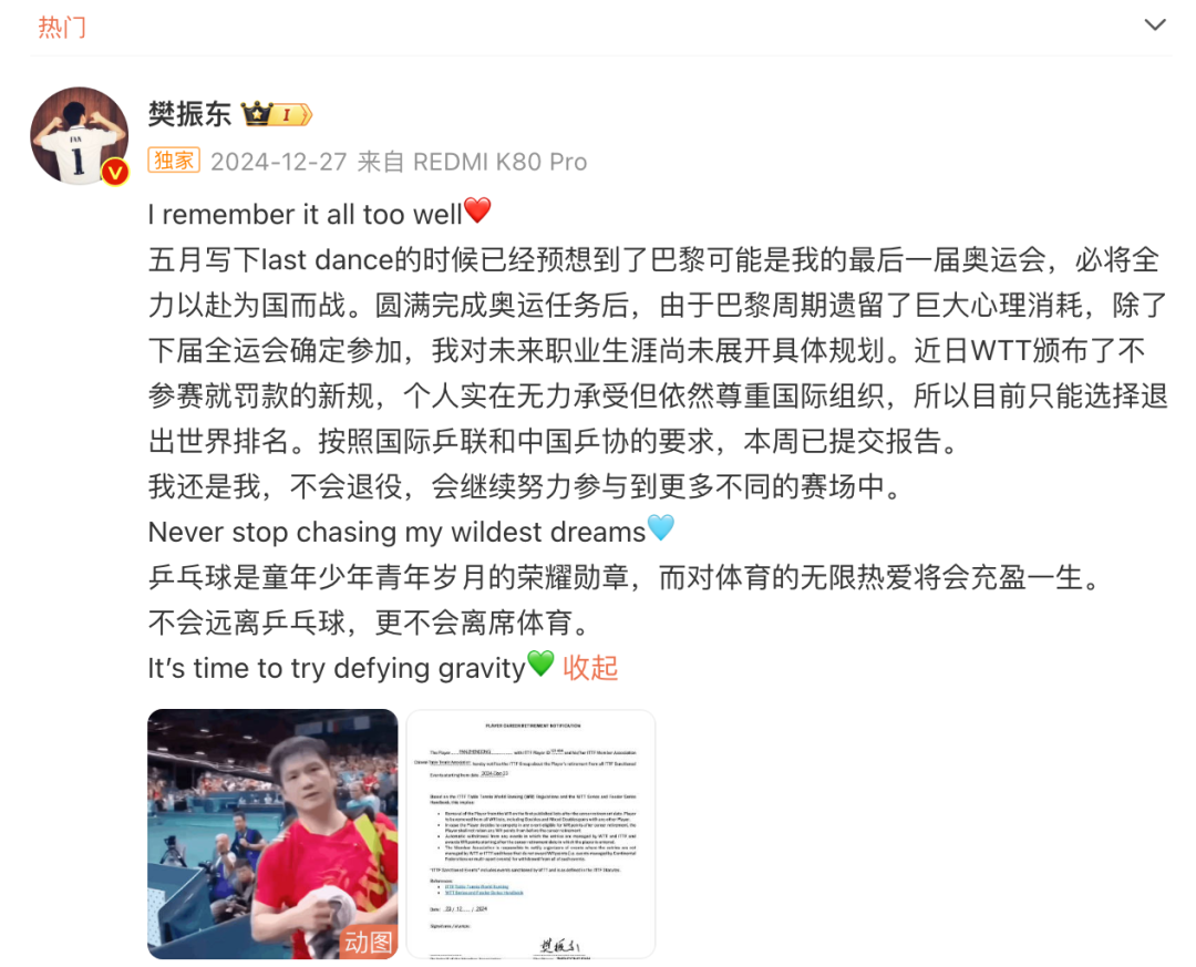 2024年12月27日,樊振东在微博上发文表示:“由于巴黎周期遗留了巨大心理消耗,除了下届全运会确定参加,我对未来职业生涯尚未展开具体规划。近日WTT颁布了不参赛就罚款的新规,个人实在无力承受但依然尊重国际组织,所以目前只能选择退出世界排名。按照国际乒联和中国乒协的要求,本周已提交报告。”樊振东表示,“不会退役,会继续努力参与到更多不同的赛场中。”