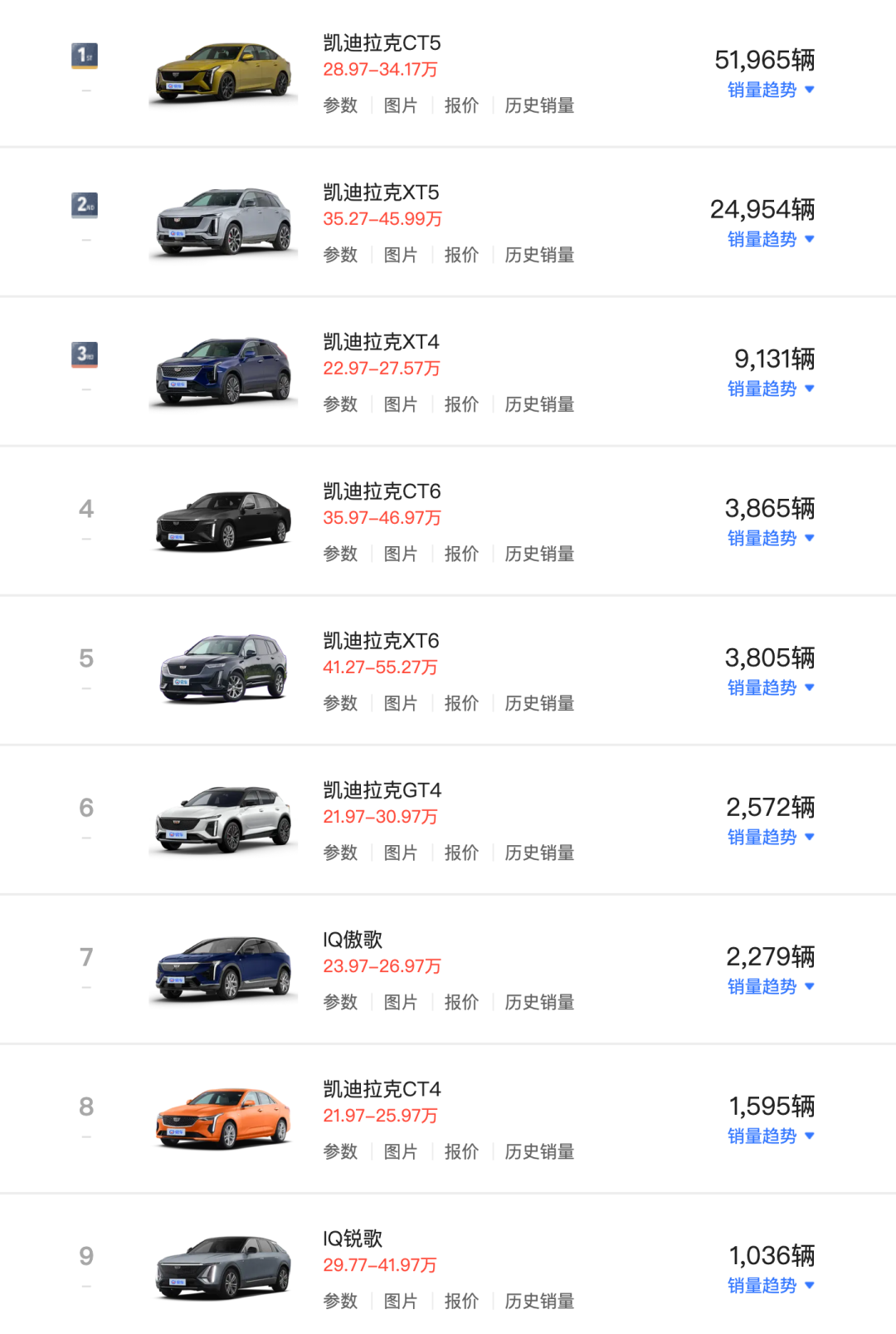 零售数据显示,2024年前11月凯迪拉克品牌累计销量101202辆,销量最高的车型是CT5,为51965辆,XT5为24954辆。最新数据显示,2024年12月,凯迪拉克品牌销量为14097辆,其中XT5为6161辆,CT5为5668辆。