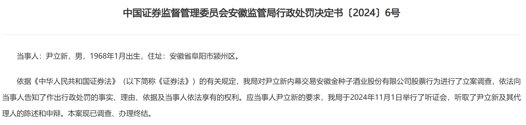 此外,内幕信息敏感期内,尹立新通过“尹立新”证券账户买入“金种子酒”7.19万股,成交金额120.89万元,后全部卖出,卖出金额129.49万元,扣除税费后盈利7.94万元;“刘某”证券账户买入“金种子酒”6.45万股,成交金额97.16万元,后全部卖出,卖出金额127.64万元,扣除税费后盈利30.28万元。上述两个账户合计盈利38.21万元。