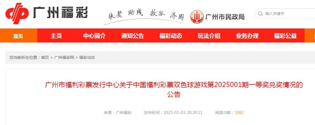 1月3日晚,广州市民政局广州福彩网发布了双色球今年第一期一等奖兑奖情况公告。
