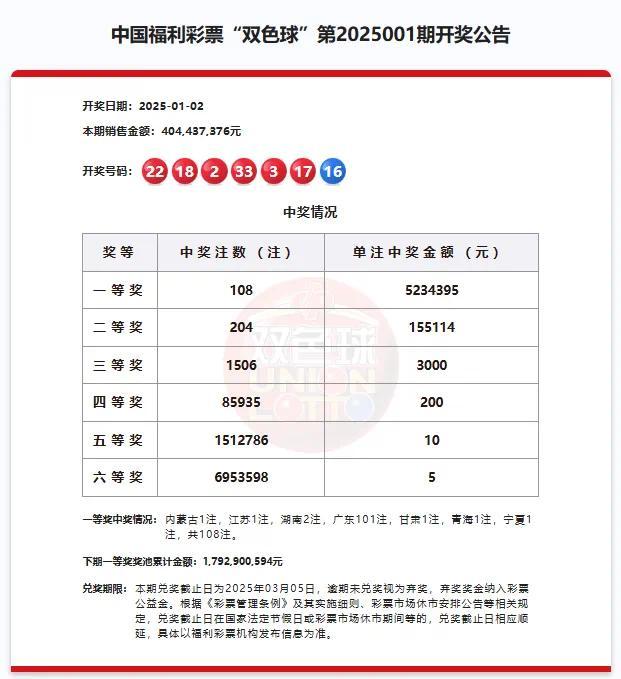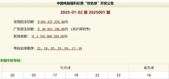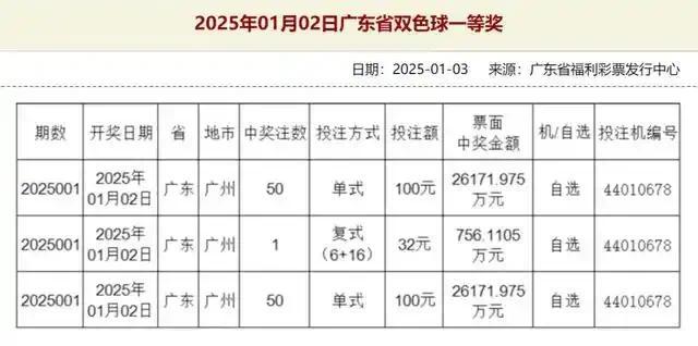 公告显示,中国福利彩票双色球游戏第2025001期于1月2日开奖,当期广州市中出一等奖的彩票共3张,其中2张均为100元50倍的单式票,1张为32元的蓝球全包复式票,3张中奖彩票共计中得101注一等奖和15注二等奖,奖金合计人民币531000605元。